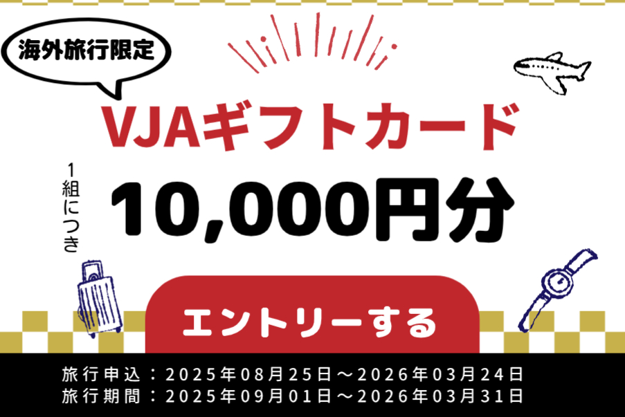 下記バナーよりHISの海外旅行をお申込みいただいた方へ、先着10組へ「VJAギフトカード」を進呈いたします!!
